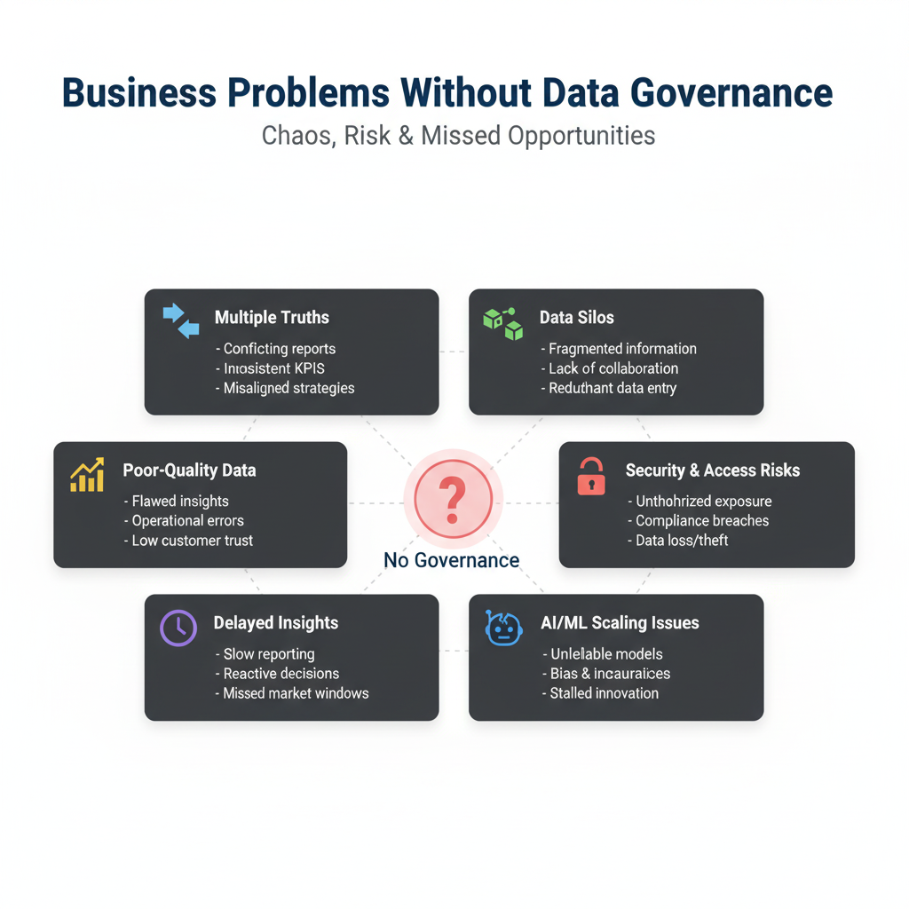 Many companies have world-class cloud platforms, analytics tools, and AI pilots. But without governance, they end up with:
